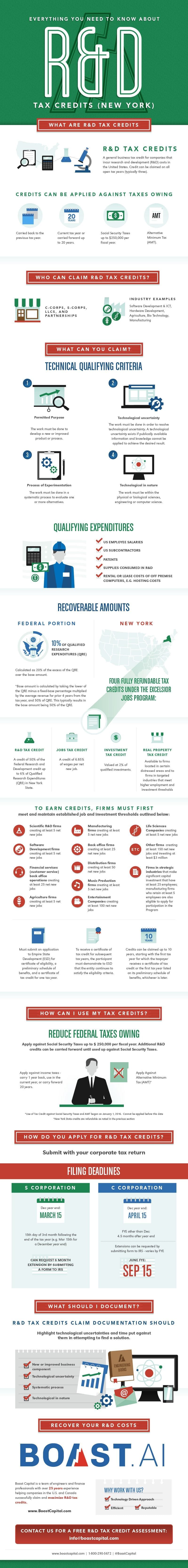 - Research and Development (R&D) Tax Credit: A credit of 50% of the Federal Research and Development credit up to six percent of Qualified Research Expenditures (QRE) in New York State.
